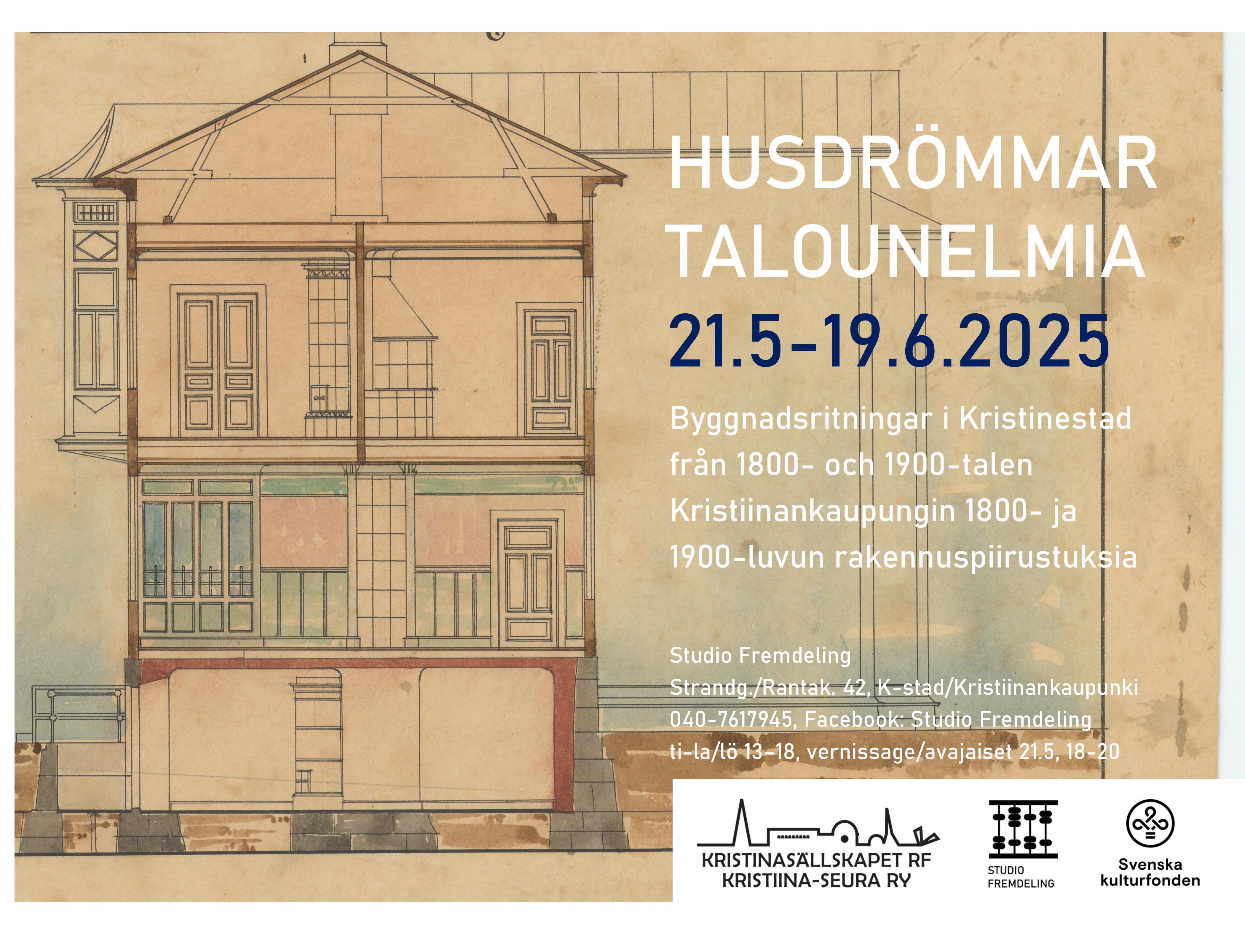 The Husdrömmar – Talounelmia exhibition has been curated by Dag Björklund, the initiator of the digital archive and the chairperson of the society. The exhibition offers a glimpse into how stylistic trends in history have reflected upon a small northern wooden house town, while also asking: What were the dreams of homes like in days gone by? Which houses remain, and which have vanished from the townscape, and which dreams never made it beyond the drawing board? What might a different Kristiinankaupunki look like today?