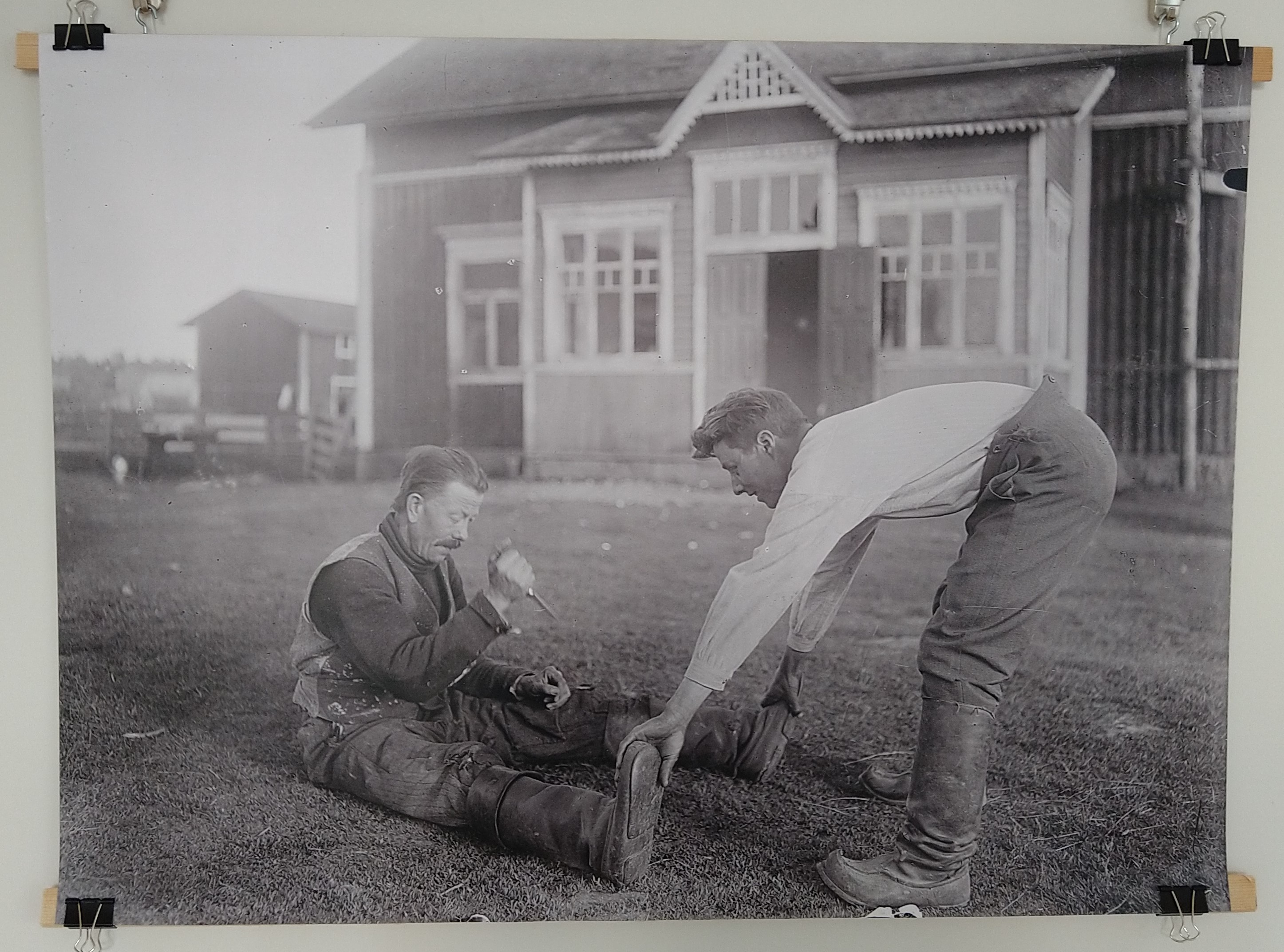 The photographs bear witness to the culture of a traditional agrarian society. The rural environment with improvised sports equipment as hay poles and roof beams evokes nostalgia in the viewer. The physical exercises may be playful in nature and have humorous names, but the focus is on the competitive element, and they serve as ritual tests of manhood. Physical strength was a necessity in the rural environment, but Stejskal’s text material shows how the tests of strength were also part of a culture of violence involving fights, hazing, alcohol, jealousy and petty local patriotism. Not everything was better in the past.